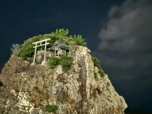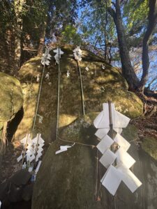 奥宮である夫婦岩は、3つの岩が寄り添い合っており、スサノヲノミコトとクシナダヒメ、二人の子のスガノユヤマヌシミナサロヒコヤシマノミコトが祀られています。